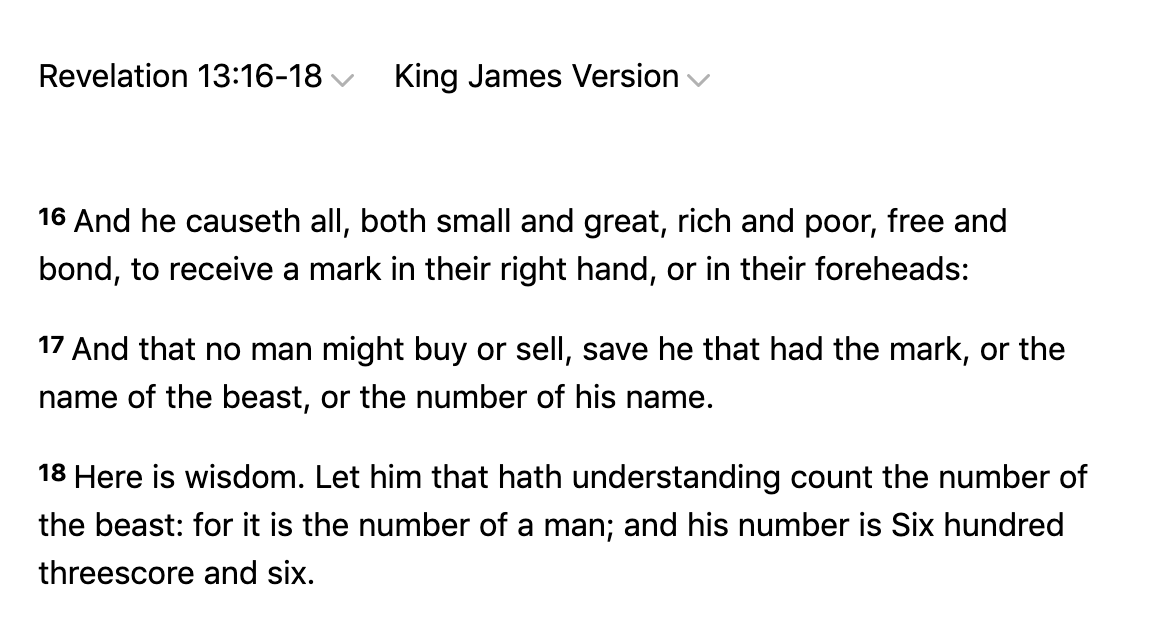 Revelation 13:16-18And he causeth all, both small and great, rich and poor, free and bond, to receive a mark in their right hand, or in their foreheads: And that no man might buy or sell, save he that had the mark, or the name of the beast, or the number of his name.Here is wisdom. Let him that hath understanding count the number of the beast: for it is the number of a man; and his number is Six hundred threescore and six.